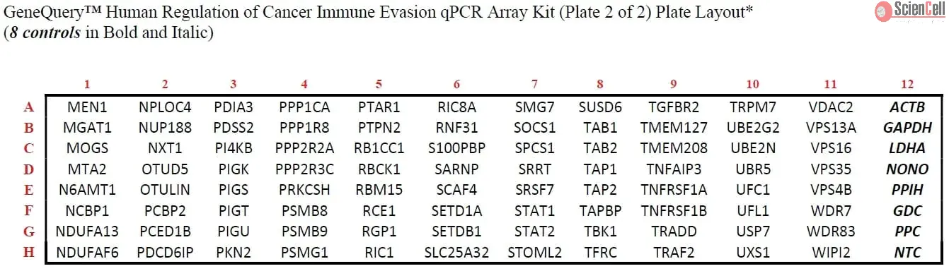 癌细胞的一个特征是它们获得了逃避免疫系统清除的能力。ScienCell 的 GeneQuery™ 人类癌症免疫逃逸调控 qPCR 阵列试剂盒(第 2 板,共 2 板)(GQH-CIE1 和 GQH-CIE2)旨在帮助更好地理解癌细胞如何逃避免疫控制的机制。所选择的基因在被干扰时已被证明能够增强或降低癌细胞对免疫控制的抵抗能力。