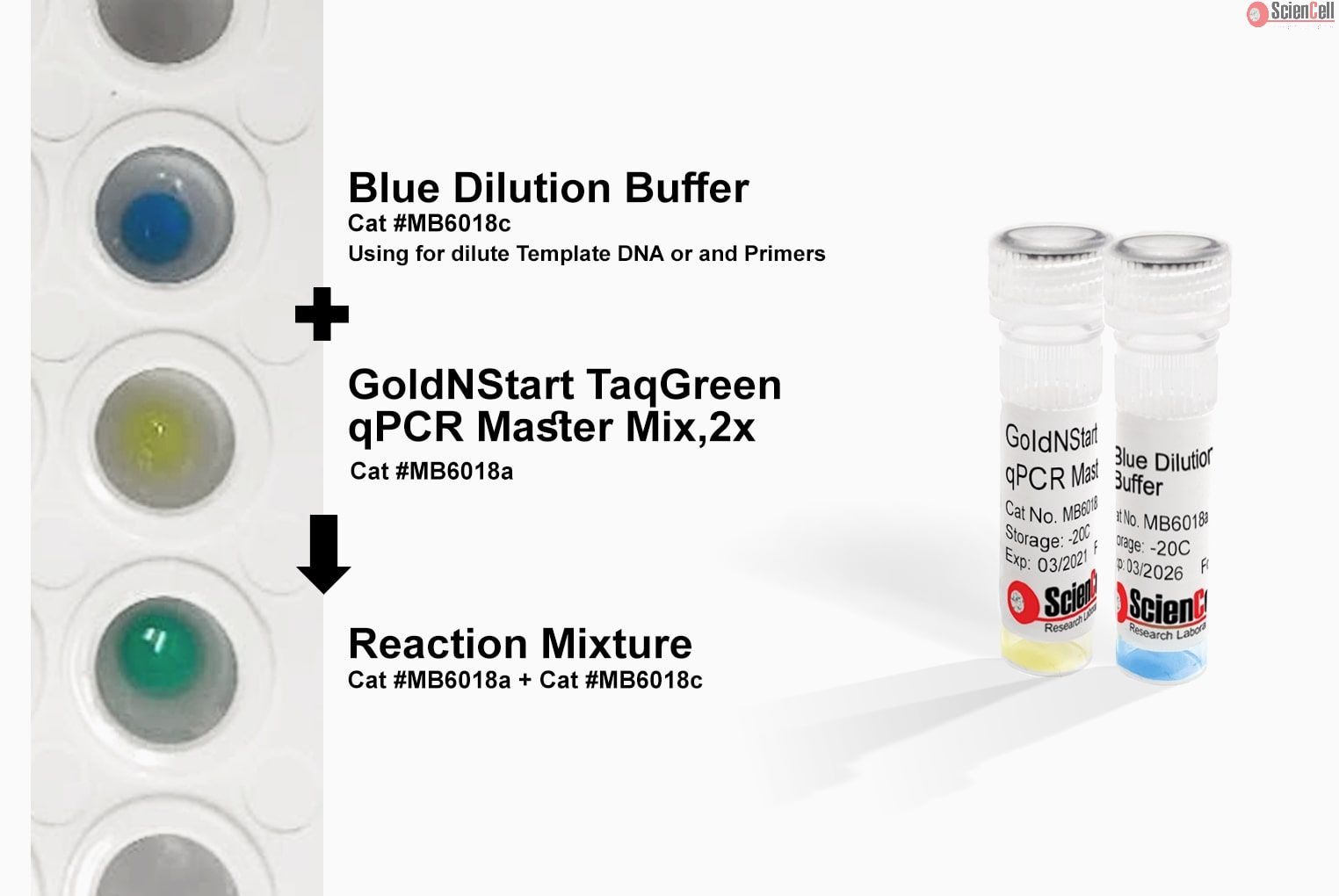 该 2X 主混液在单管中含有 SYBR® Green、dNTP、Taq DNA 聚合酶以及惰性金色上样指示剂(ScienCell,目录号 #GQ300G)。