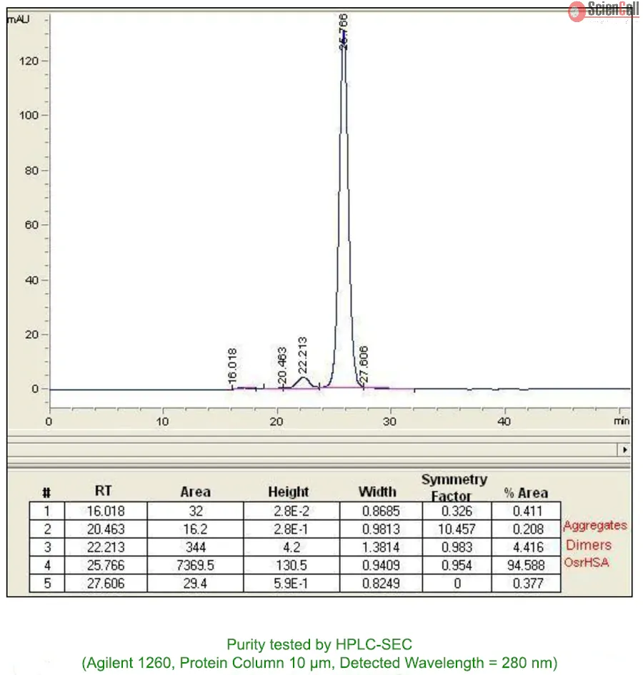 Human serum albumin (HSA) is the most abundant protein found in human blood plasma. It is produced in the liver. The biological functions of albumin include normalization of the colloidal osmotic blood pressure and transportation and metabolization of endogenous and exogenous molecules (e.g. fatty acids, amino acids, steroids, hormones, metals) and pharmaceutical drugs.