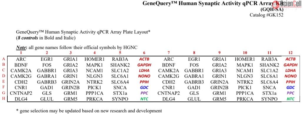 ScienCell’s GeneQuery™ Human Synaptic Activity qPCR Array Kit (GQH-SA) profiles 40 key genes that regulate human synaptic transmission, plasticity, and activity-dependent signaling.