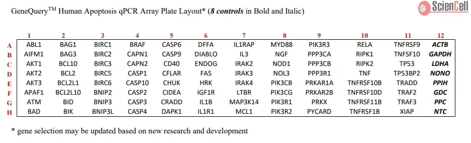 This product is designed to facilitate gene expression profiling of key genes involved in human apoptosis. 88 genes are selected in this kit based on public database and literature research.